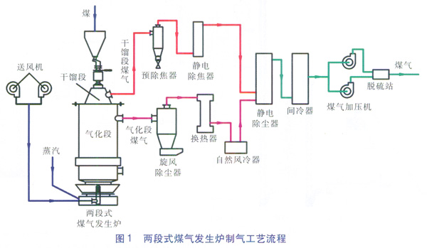 由于干餾段為煤的低溫干餾,因此干餾段煤氣含有未裂解的輕質(zhì)焦油,需要采用除焦器去除干餾段煤氣中的焦油。氣化段煤氣往往含有炭黑、灰塵、水分,需要采用旋風(fēng)除塵器等設(shè)備進行除塵[5],并利用換熱設(shè)備脫除氣化段煤氣中的水分。經(jīng)處理后的干餾段煤氣、氣化段煤氣混合后經(jīng)煤氣加壓機及脫硫后供給用戶。
