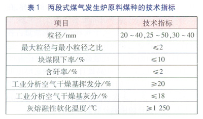 兩段式煤氣發(fā)生爐適宜氣化的煤種為不粘煤、弱粘煤、長焰煤等煙煤。雖然相對單段式煤氣發(fā)生爐而言,兩段式煤氣發(fā)生爐適用煤種范圍較寬,但是對原料煤的指標(biāo)仍然要求比較嚴(yán)格。兩段式煤氣發(fā)生爐原料煤種的技術(shù)指標(biāo)見表1。塊煤限下率:塊煤中小于規(guī)定粒徑下限部分的質(zhì)量分?jǐn)?shù)。熱穩(wěn)定性指標(biāo)TS+6:量取一定量粒徑為6~13mm的煤樣,在(850±15)℃的馬弗爐內(nèi)隔絕空氣條件下加熱30min后稱量、篩分,粒徑大于6mm的殘焦質(zhì)量占各級粒徑殘焦質(zhì)量之和的百分比??顾閺姸缺碚饕欢降拿簶幼杂陕湎潞罂蛊扑榈哪芰Γ簩⒘綖?0~100mm的塊煤從2m高處自由落到規(guī)定厚度的鋼板上,然后將落下的煤中粒徑大于25mm的塊煤再次落下,共落下3次,以破碎后粒徑大于25mm的塊煤占原煤樣的質(zhì)量分?jǐn)?shù)表示煤的抗碎強度。